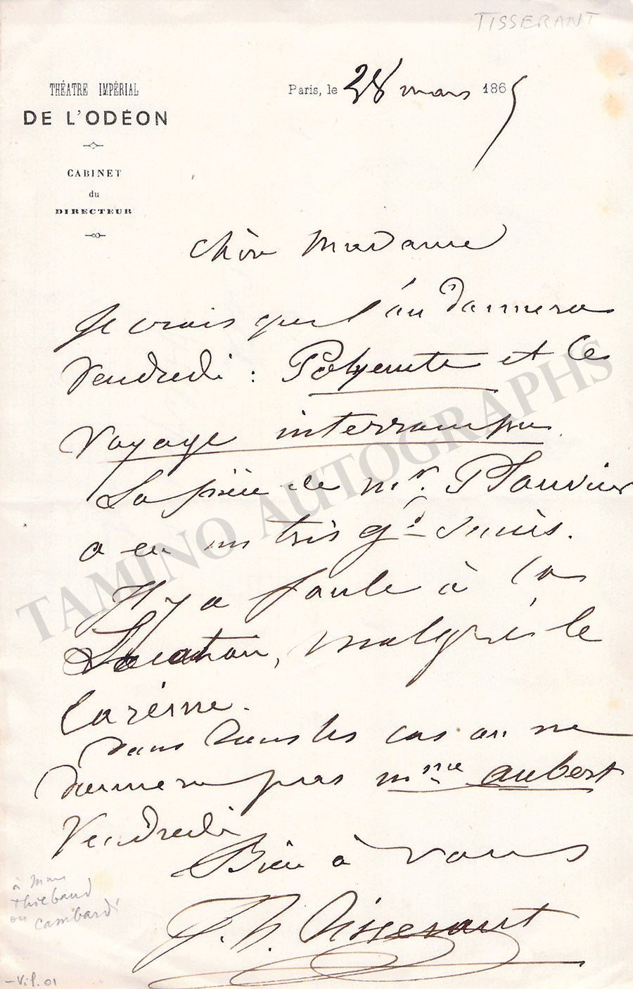 Autograph letter in Frech signed by him, dated in Paris, March 28, 1865, to a lady: “...je crois que l’on donnera vendredi: Polyeucte et le voyage interrompu. La soirée de Mr. P Tauvier a eu un très grand succès...”.