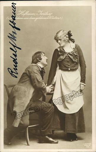 Signed photo postcard of the German baritone (1874-?) as Jack Rance in Puccini's La Fanciulla del West with soprano Maria Jeritza as Minnie. Size 3.25 x 5.5 inches.