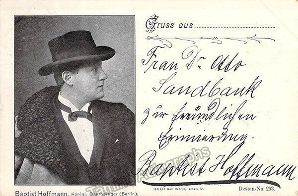 German baritone (1863-1947), signed postcard photograph, shown as himself, inscribed. Photo by Max Marcus, Berlin. Size is 3.5 x 5.5 inches, very small creases on some edges, otherwise in excellent condition.