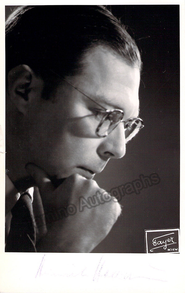 German conductor (1913-2006), was the principal conductor of the Bavarian State Opera and, later, the Vienna State Opera, with appearances as guest conductor with many important orchestras. Signed photo by Fayer, Vienna, 3.5 x 5.5 inches, stamped on verso by photographer. Signature is a bit faint but clearly visible.