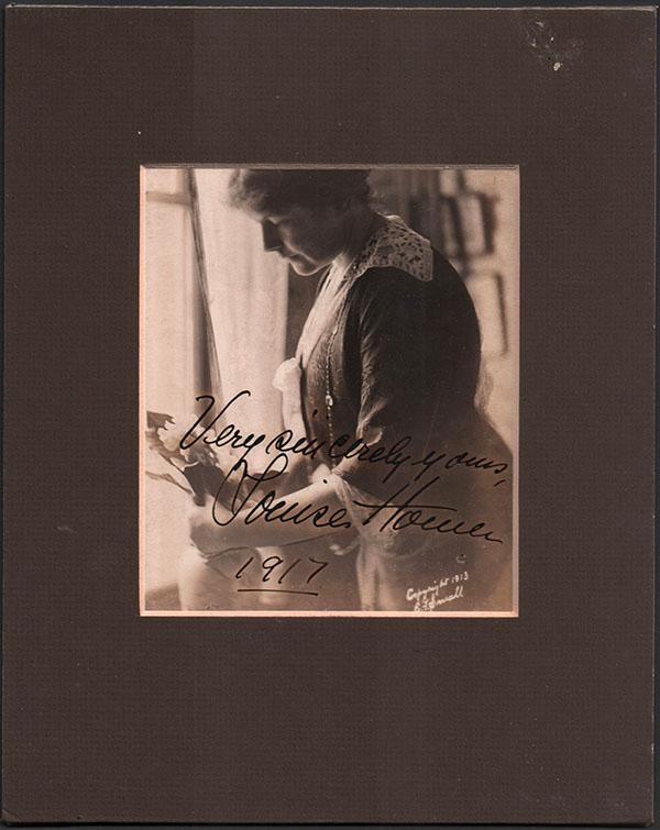 Star American contralto (1871-1947), one of the most beautiful voices of the golden era of singing. Signed photo, trimmed from a larger photo, shown as herself, dated in 1917. Bold handwriting and signature. Printed signature by photographer on front. Size is 4.75 x 5.5 inches, in excellent condition.