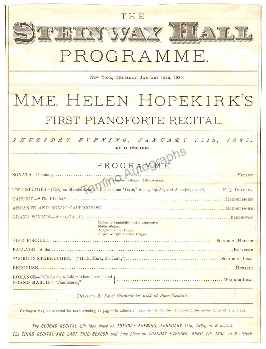 Clip (cut) from a program for a concert in 1885 at the Steinway Hall, New York, with Scottish pianist and composer Helen Hopekirk performing music by various composers.
