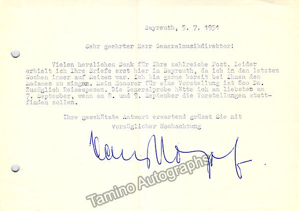 German tenor (1916-1993), known for Wagnerian and other heroic tenor roles. Typed Letter Signed, dated in Bayreuth in 1951, written in German and sold untranslated. Size is 6 x 8.25 inches, in excellent condition.