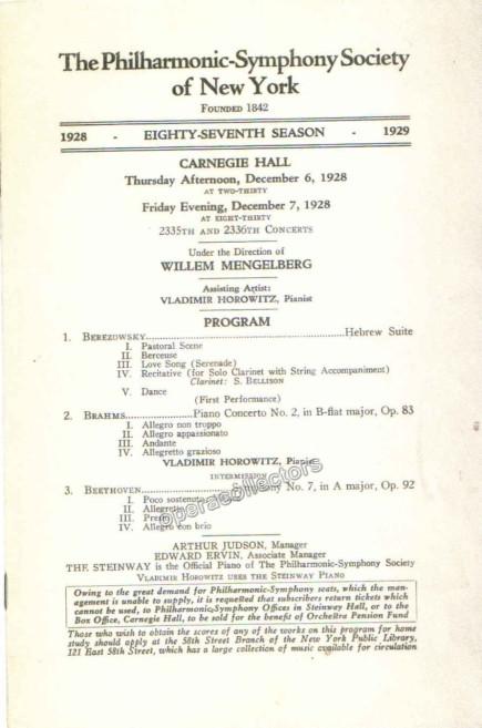 Concert Willem Mengelberg conducting New York Philharmonic, Berezowsky Brahms Beethoven