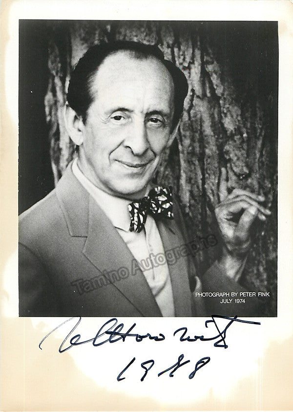 Russian-american pianist (1903-1989), one of the greatest of the 20th century. Portrait photo of the great pianist, signed by him at the bottom and dated in 1978. Size is 5 x 7 inches, yellowish tone over the left border and the bottom, otherwise in excellent condition - priced accordingly