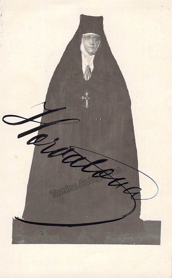 Fine black-and-white photo postcard signed by her in 1917, shown in role. Size is 5.3 x 3.25 inches, in very good condition.
