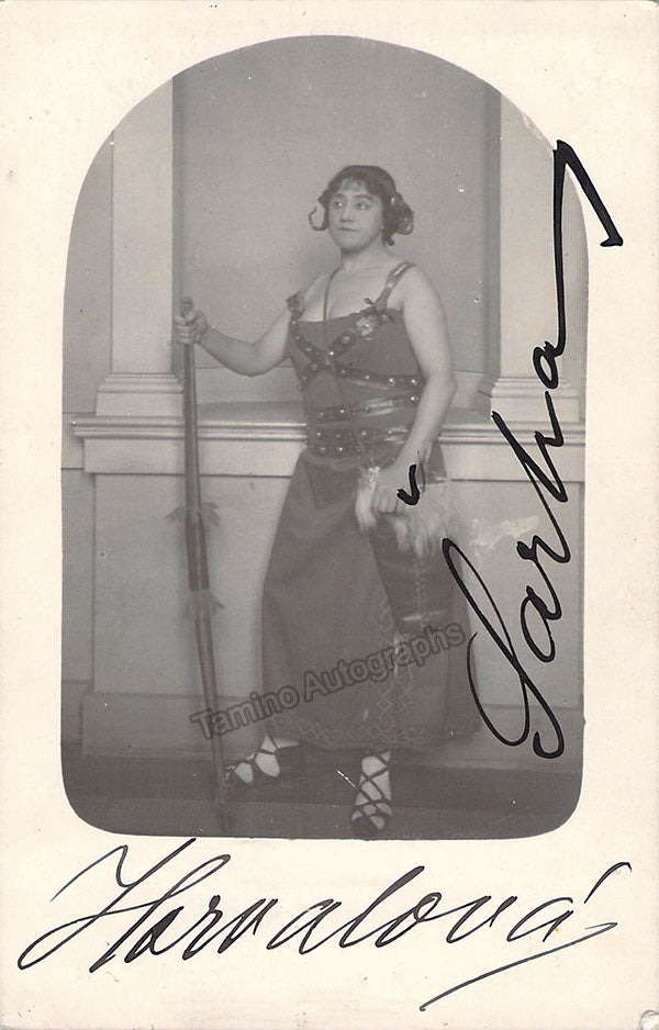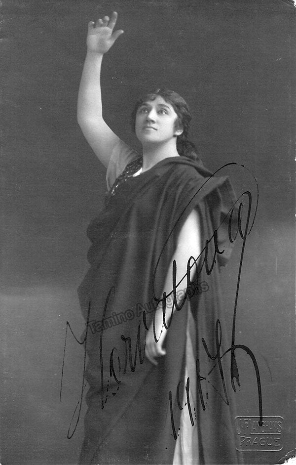 Black-and-white photo postcard signed by her in 1917, show in role; blind-stamped on the front by photographer J.F. Langhans. Size is 3.4 x 5.25 inches, in very good condition.