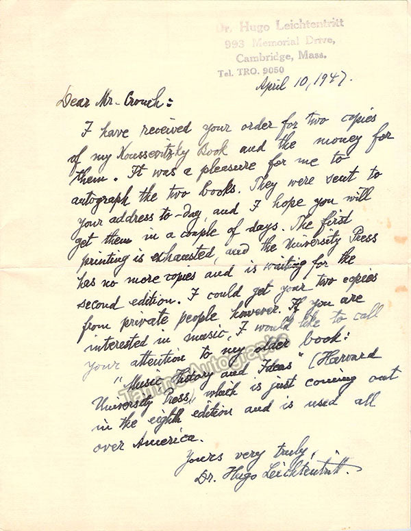 Leichtentritt, Hugo - Autograph Letter Signed 1947 Leichtentritt, Hugo - Autograph Letter Signed 1947