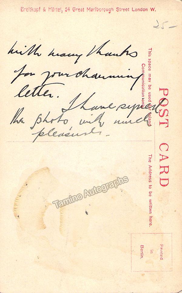 English tenor (1875-1951), signed photo postcard, shown as himself. Inscribed with additional sentiment on verso. Photo by Breitkopf and Hartel, London. Size is 3.25 x 5.25 inches, some silvering on front surrounding the text but not affecting the signature. Otherwise in good condition.
