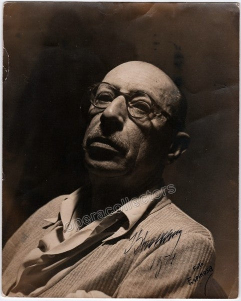 Russian, later French and American composer (1882-1971), widely considered one of the most important of the 20th century. Great signed photo, dated by him in 1954, by Espinosa (handwritten by the photographer "Foto Espinosa") - bold, very clear signature with superb contrast. Size is 8 x 10 inches, some creases, otherwise in very good condition