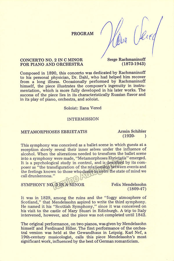 Program for a concert by the Israeli pianist performing Rachmaninoff's Piano Concerto No.2 with La Suisse Romande Orchestre in New York, October 1974, signed by her on the program page.