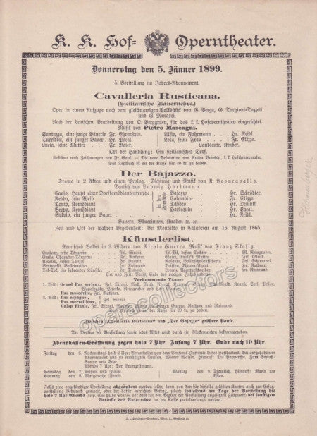 Imperial & Royal Court Opera Playbill - Cavalleria Rusticana, Pagliacci, Kunstlerlist - Jan. 5th, 1899