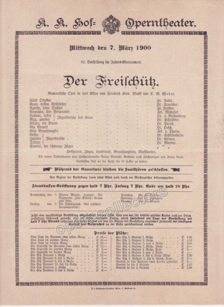 Imperial & Royal Court Opera Playbill - Der Freischutz - March 7th, 1900