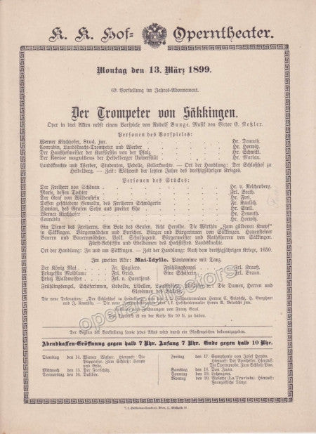 Imperial & Royal Court Opera Playbill - Der Trompeter von Sakkingen - March 13th, 1899
