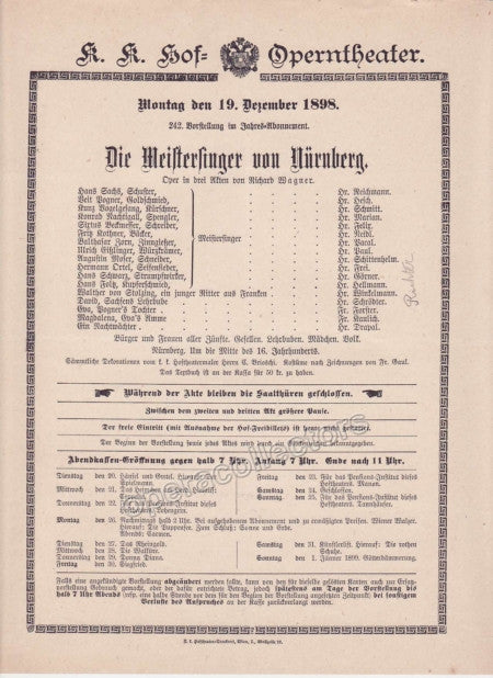 Imperial & Royal Court Opera Playbill - Die Meistersinger von Nurnberg - Dec. 19th, 1898