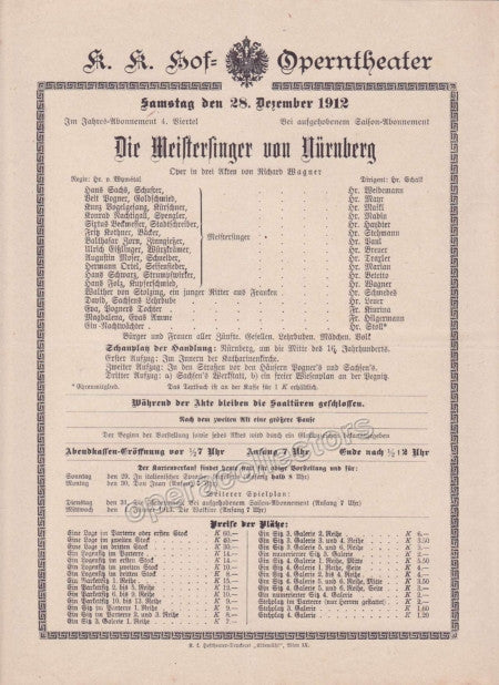 Imperial & Royal Court Opera Playbill - Die Meistersinger von Nurnberg - Dec. 28th, 1912
