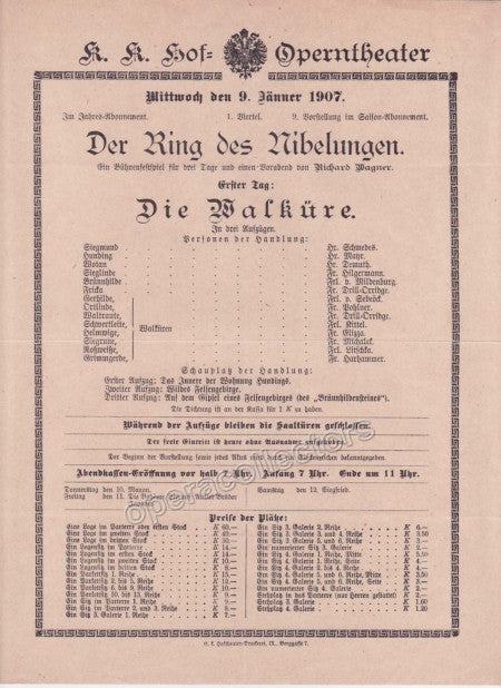 Imperial & Royal Court Opera Playbill - Die Walkure - Dec. 5th, 1899