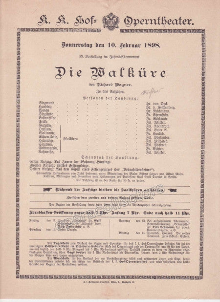Imperial & Royal Court Opera Playbill - Die Walkure - Feb. 10th, 1898