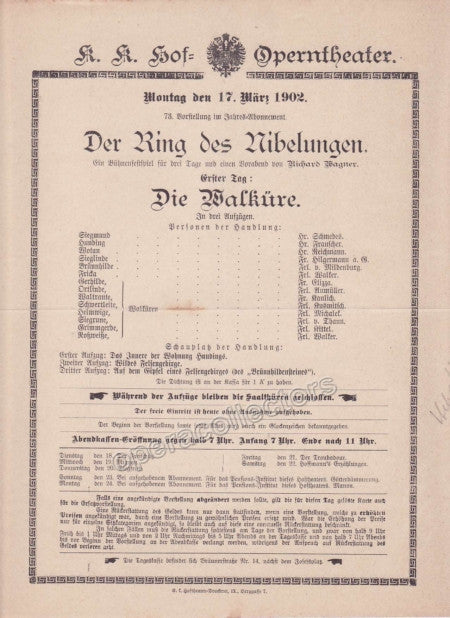 Imperial & Royal Court Opera Playbill - Die Walkure - March 17th, 1902