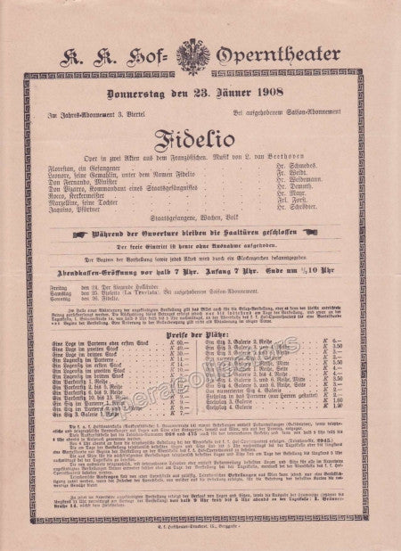 Imperial & Royal Court Opera Playbill - Fidelio - Jan. 23rd, 1908