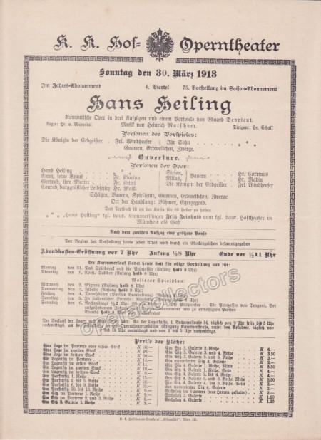 Imperial & Royal Court Opera Playbill - Hans Heiling March 30th, 1913