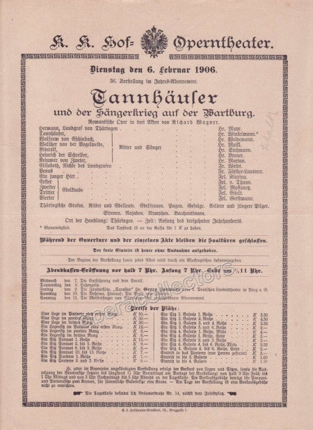 Imperial & Royal Court Opera Playbill - Tannhauser - Feb. 6th, 1906