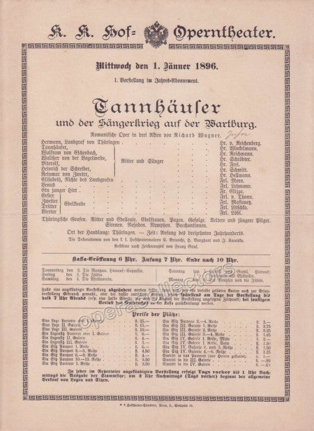 Imperial & Royal Court Opera Playbill - Tannhauser - Jan. 1st, 1896