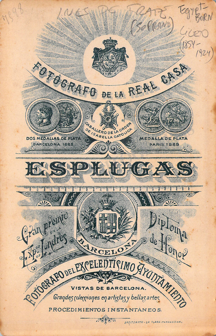 Original cabinet-style photograph of the soprano by photographer Antoni Esplugas (Barcelona). Size is 4.25 x 6.5 inches, rust stains on the front and some on verso, otherwise in very good condition.