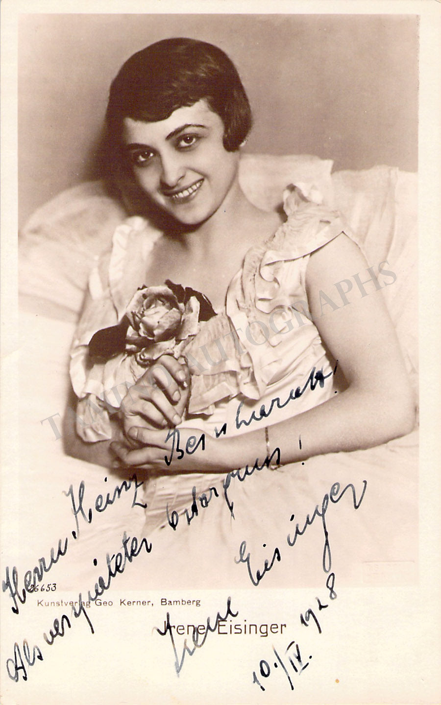 Nice black-and-white photograph signed and inscribed by her with a short sentiment in German dated 1928. Size is 3.3 x 5.3 inches, in excellent condition.