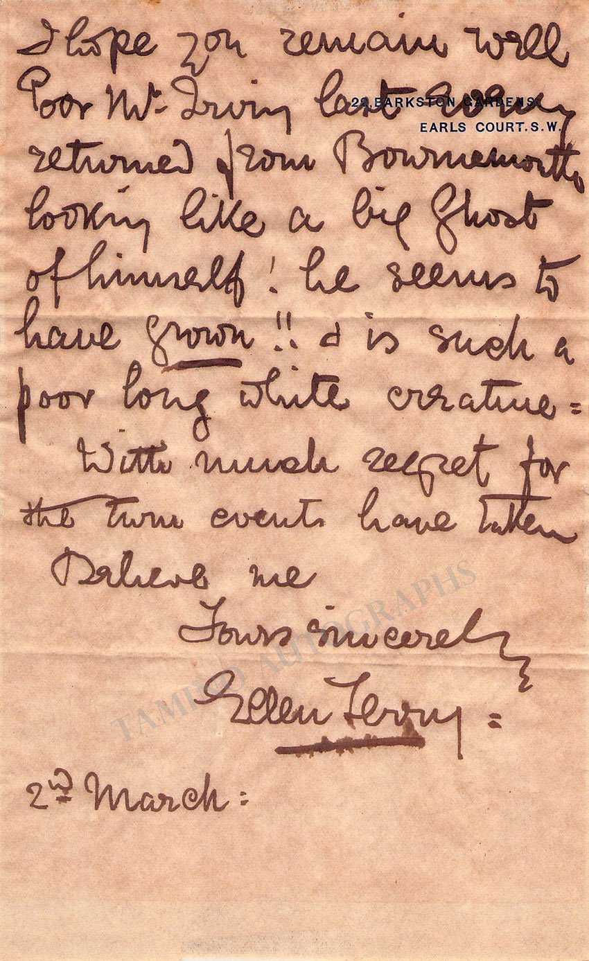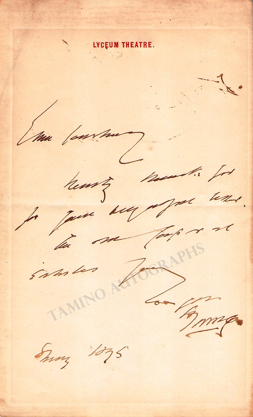 ALSO INCLUDED are two autograph notes signed by them (one for each artist),  Terry's note has no year, size is 4.75 x 7.75 inches, overall rust stains.  Irving's note has the letterhead of Lyceum Theater, dated in 1895, size is 4.8 x 8 inches, rust stains on edges.