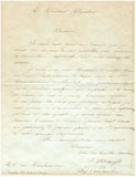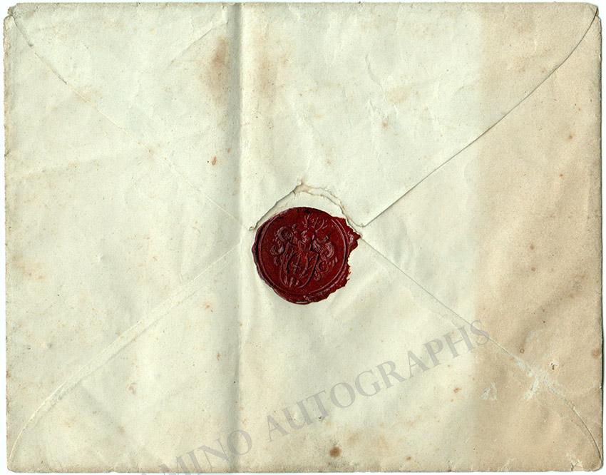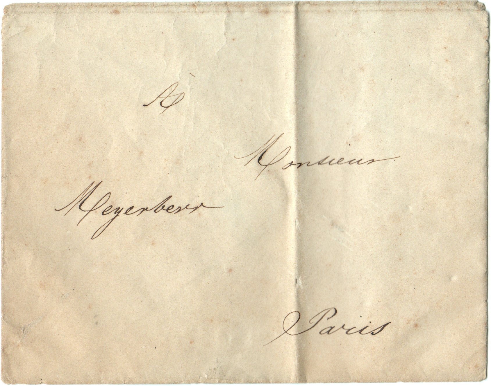 Sold transcription in French, and translation into English, and the original envelope, addressed to Meyerbeer. The letter is 7.9 x 10.4 inches, with mat burn marks close to the right and lower borders, central fold, in very good condition. The envelope is 5.5 x 4.4 inches, overall uniform aging tone, central fold, all very good condition.