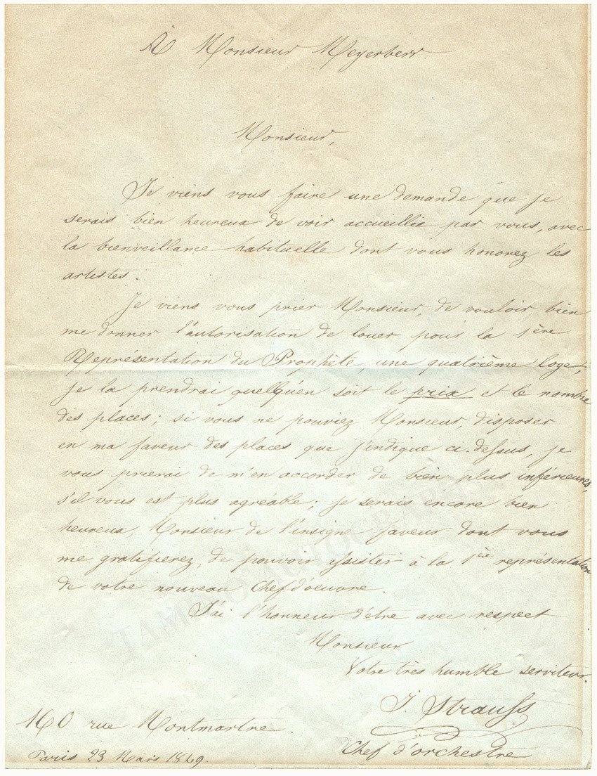 Autographs of Isaac Strauss, one of the first of the famous dynasty of musicians, are very rare, and this is a letter sent to another famous composer, connecting both men to a very important event in operatic history.