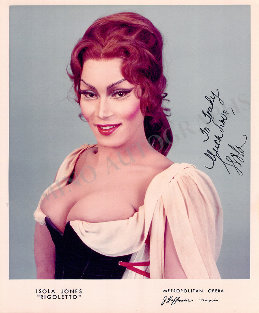 Beautiful color promo photograph by the Metropolitan Opera depicted as Maddalena in Verdi's opera Rigoletto, signed and inscribed by her with a short sentiment. Size is 8.2 x 9.9 inches, in excellent condition.