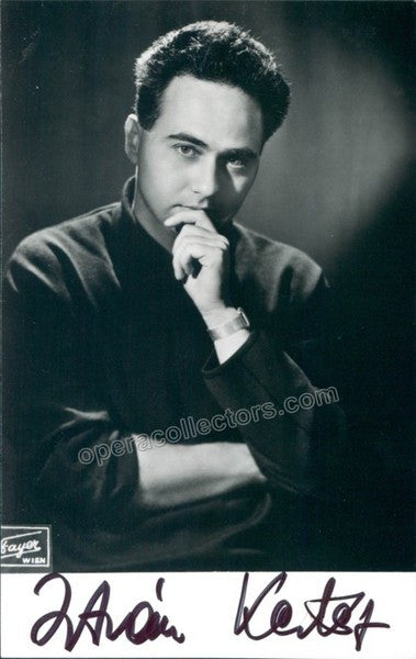 Hungarian conductor (1929-1973), was director of the Londoner Symphony, died by drowning in a beach in Israel in 1973 at age 44. Signed photo postcard, 3.5 x 5.5 inches, rare!