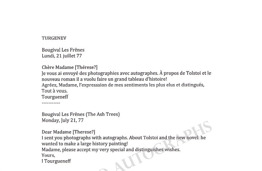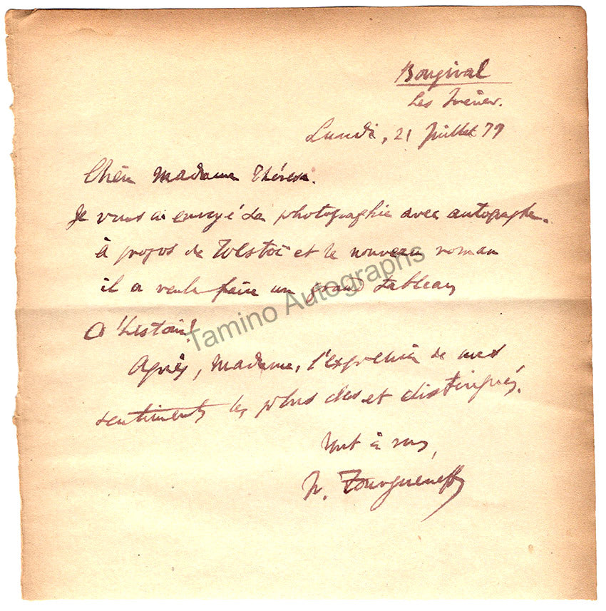 Autograph note signed and dated by him in Bougival, France, in 1877. Turgenev purchased a villa in Bougival in 1875 and died there in 1883. Turgenev writes in French to an admirer and adds a short comment about Tolstoi´s newest novel.