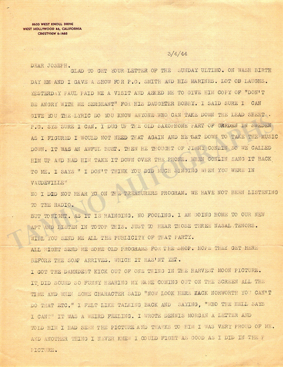 «...I gave a show for P.G. Smith and his Marines. A lot of laughs (...) I said "I don't think you did much singing when you were in Vaudeville (...) I got the damnedest kick out on one thing in the Harvest Moon Picture, it did sound so funny hearing my name coming out on the screen all the time, and when some character said "Now Look here Jack Norworth, you can't do that" (...) I felt like talking back and saying who the hell says I can't (...) I wrote Dennis Morgan a letter and that (...) thanks to him, I'm very proud of me...».