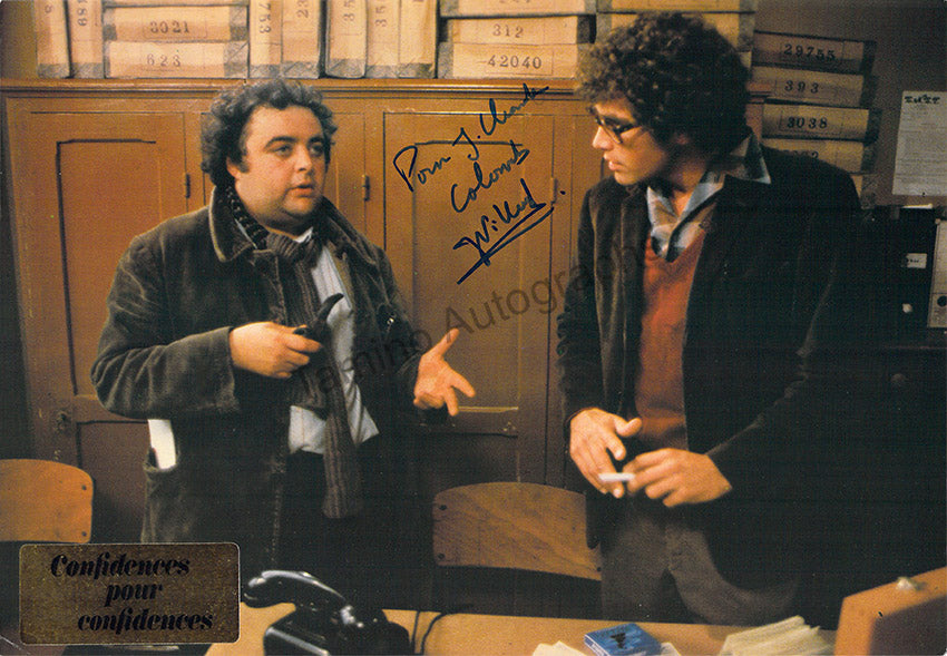 Fine larger size color movie-still photograph from the film "Confidences pour Confidences" signed by him. Size is 11.75 x 8.25 inches, in excellent condition.