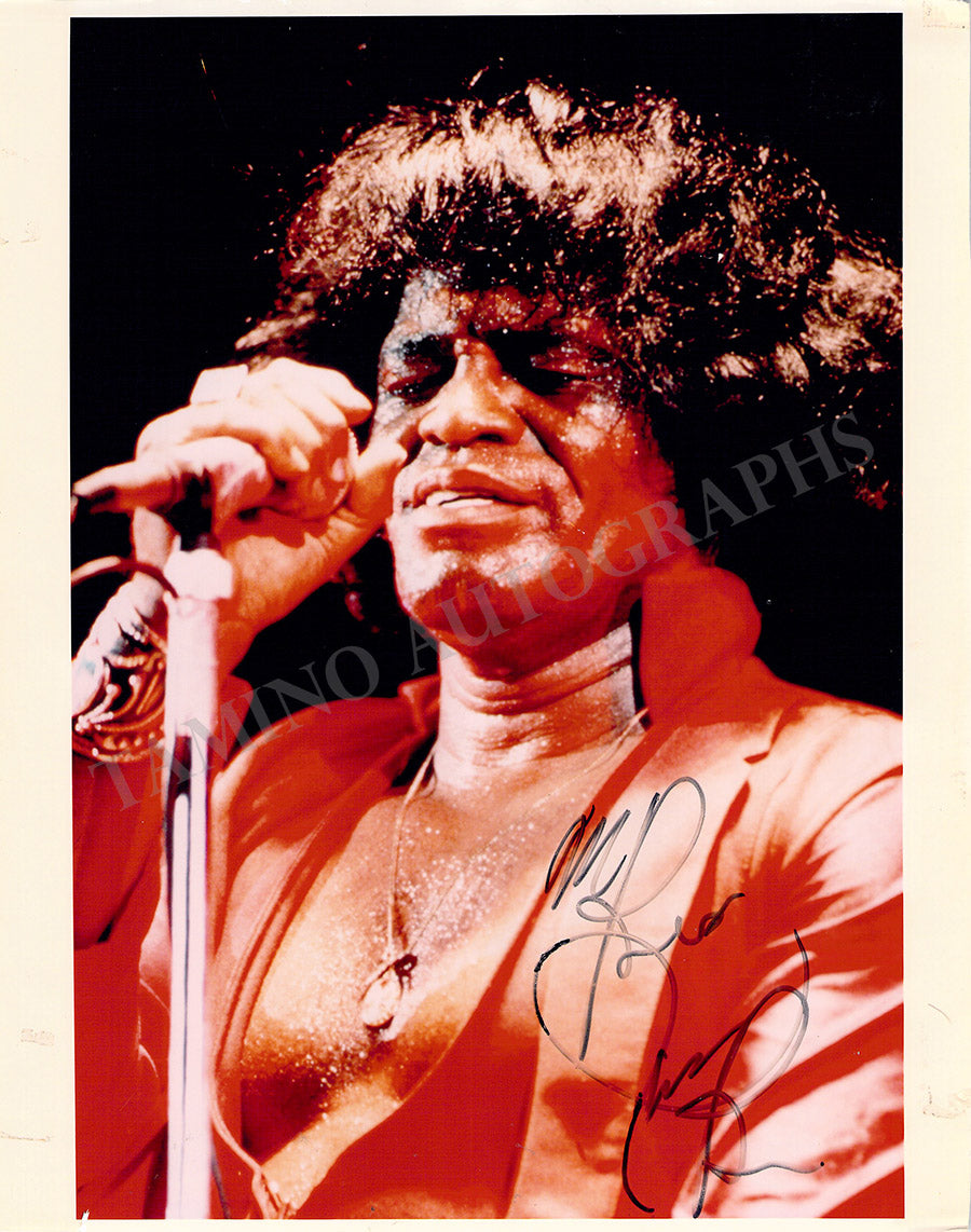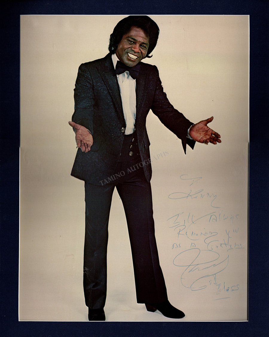Fantastic color photograph signed by him with his famous quote 'I feel good', shown in performance. Size is 7.9 x 10 inches, in excellent condition.