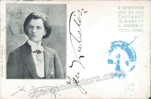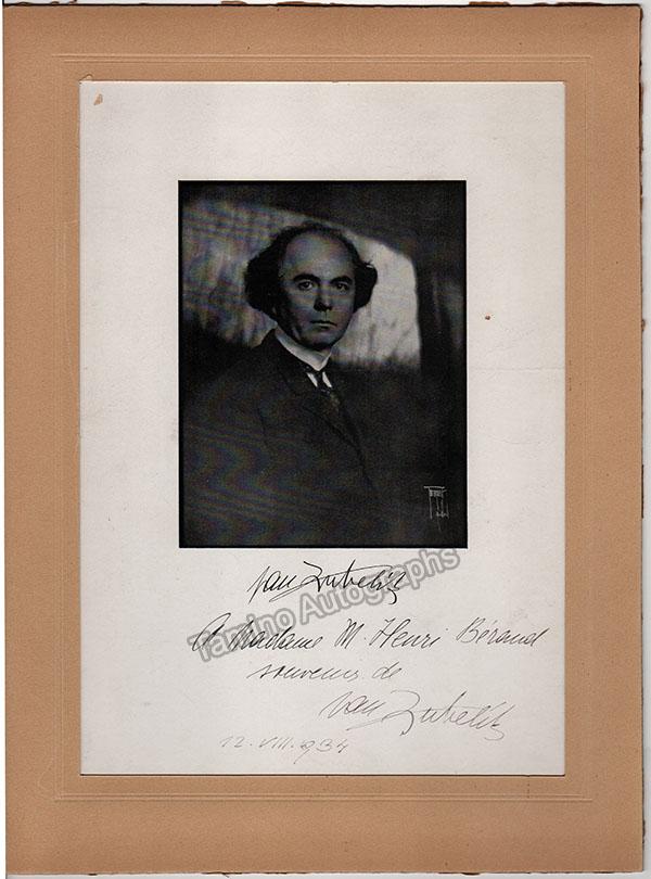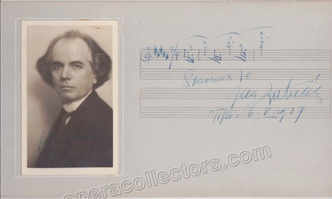 Fine photograph signed and dated by him in 1927, mounted on hard cardboard with a music quote also signed by him. Total size is 12.5 x 6.8 inches; 3.25 x 5.5 inches (photo), in very good condition