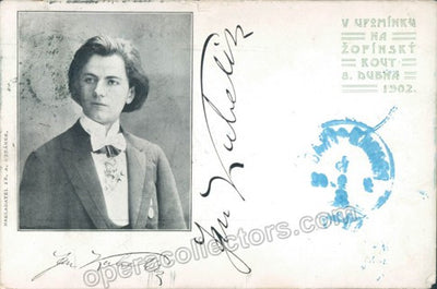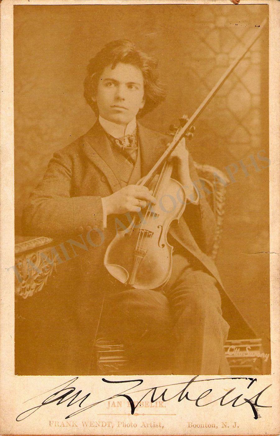 Beautiful cabinet photograph signed by him, here shown in his youth with his violin; photo by Frank Wendt (New Jersey). Size is 4.2 x 6.2 inches, in very good condition.
