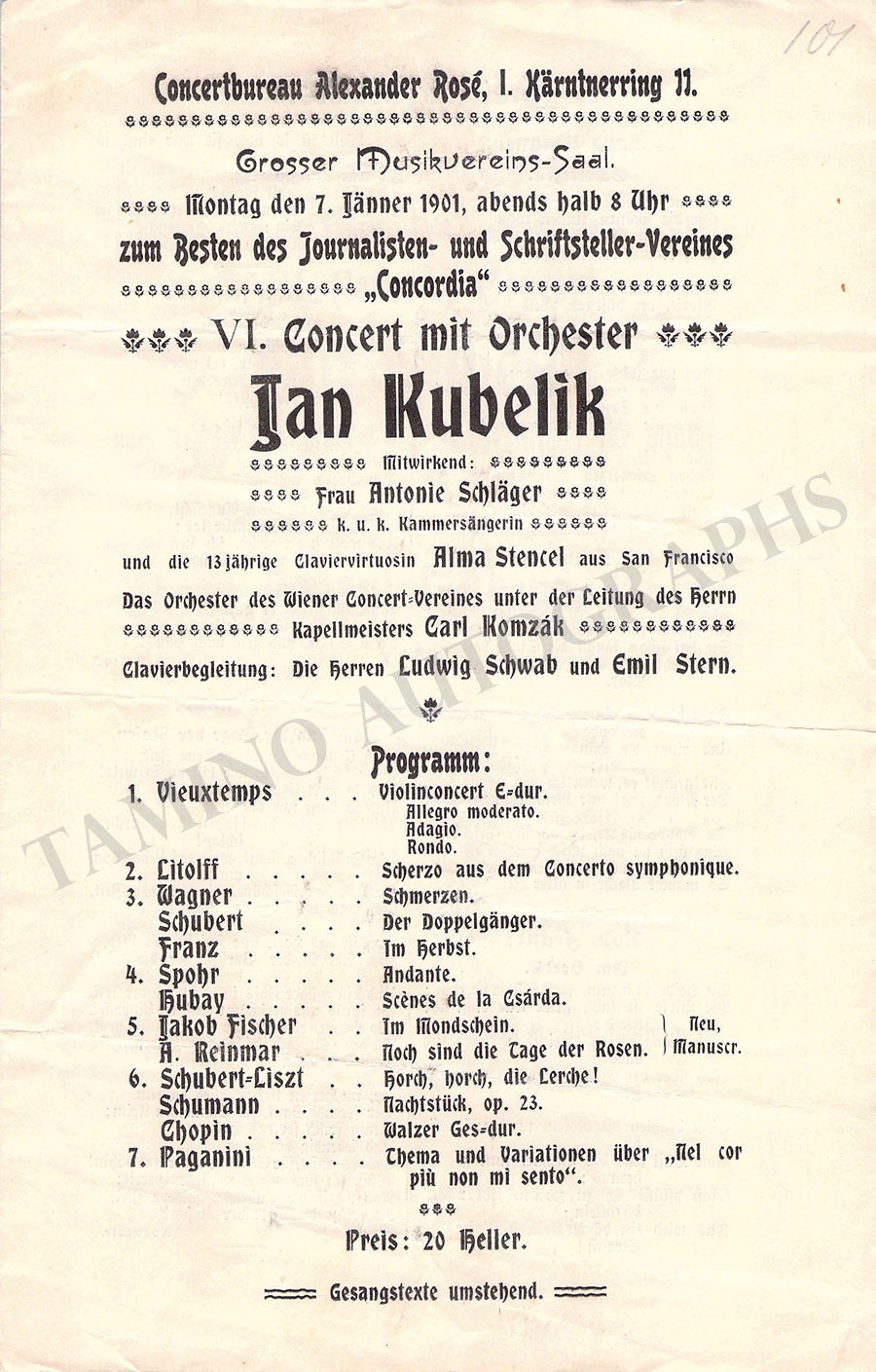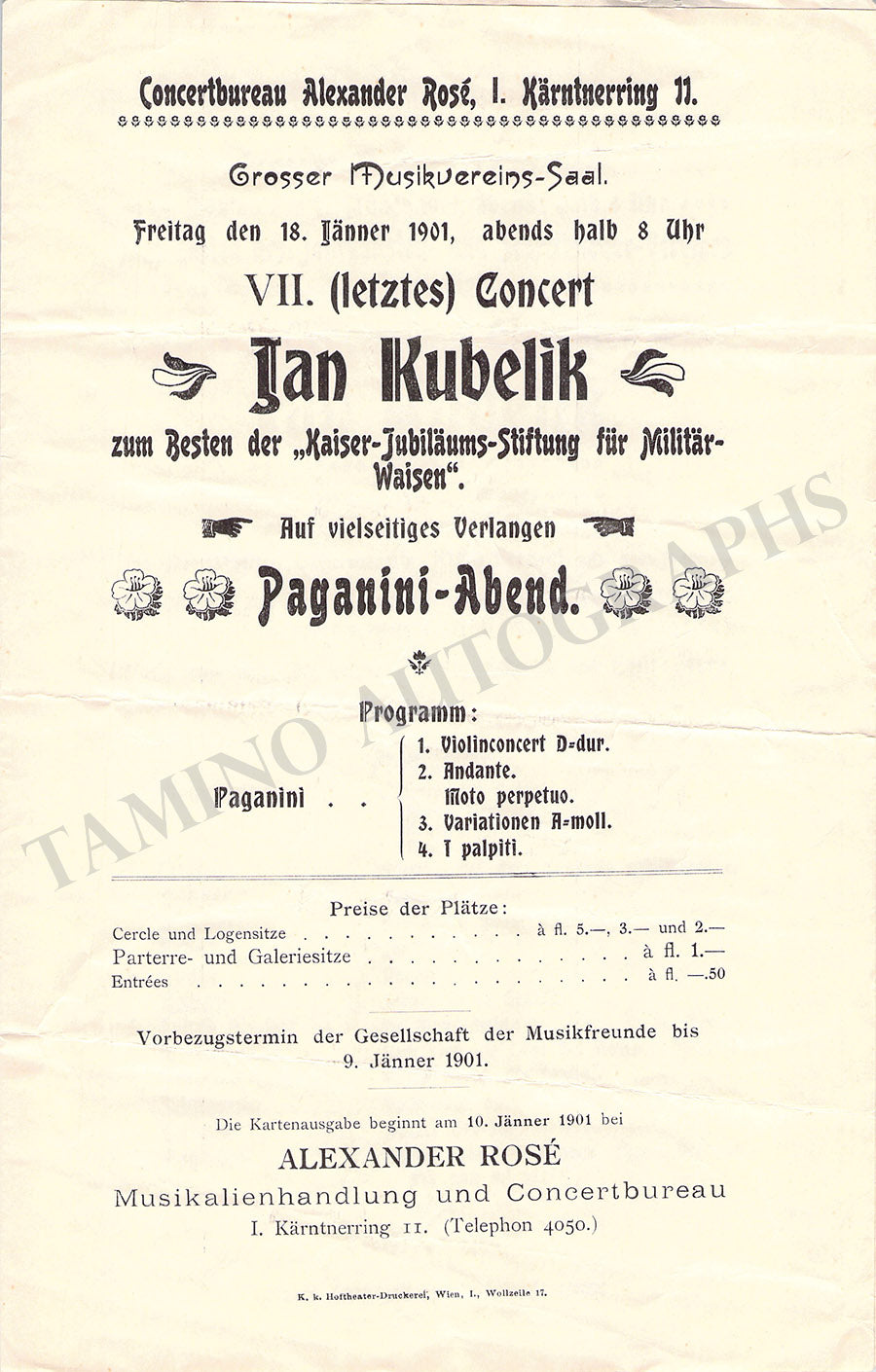 Kubelik, Jan - Concert Program Vienna 1901 Kubelik, Jan - Concert Program Vienna 1901
