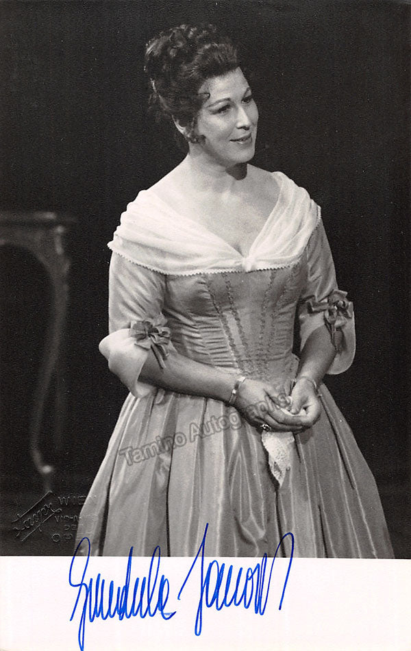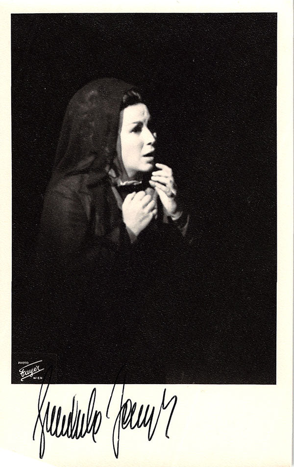 Signed photograph, shown in role (possibly the Countess in Mozart's Nozze di Figaro). Stamped on verso by Fayer photo studio, Vienna. Size is 3.5 x 5.5 inches, some bends, otherwise in very good condition.