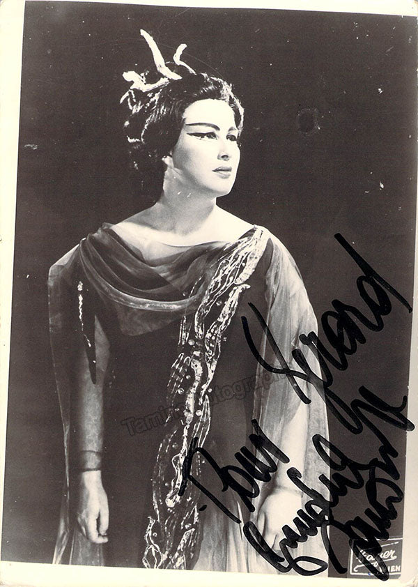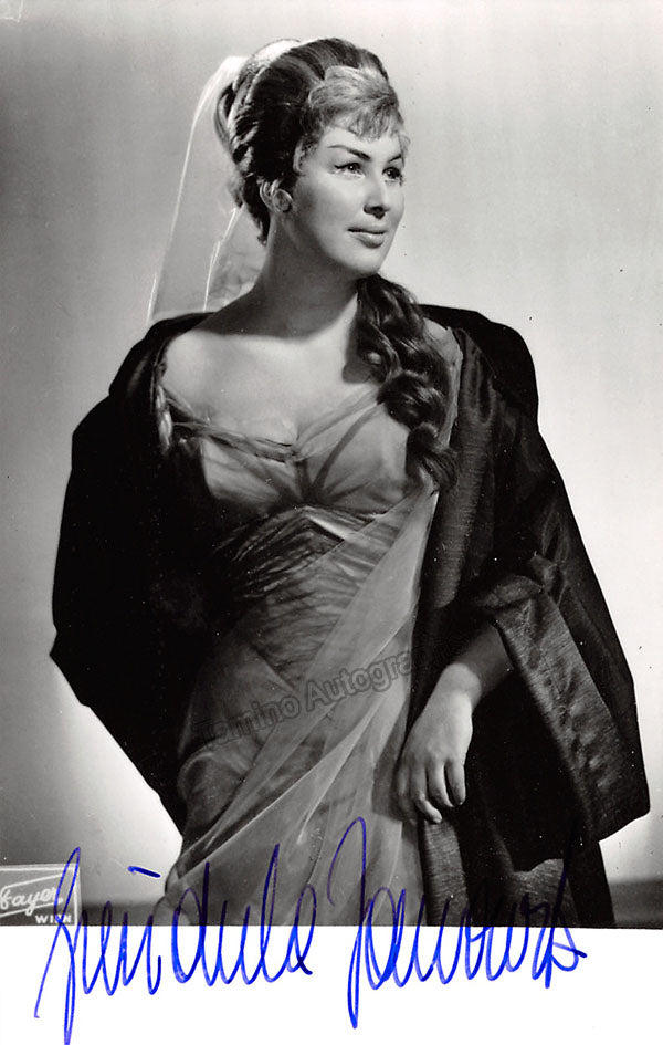 Nice black-and-white photo postcard signed by her, shown in costume for one of her operatic roles. Size is 3.5 x 5.4 inches, photo by Fayer (Vienna), in excellent condition.