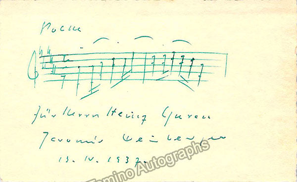 Autograph music quote on a card with 2 bars from an unknown piece signed and inscribed by him, dated in 1937. Size is 4.1 x 2 inches, in excellent condition.