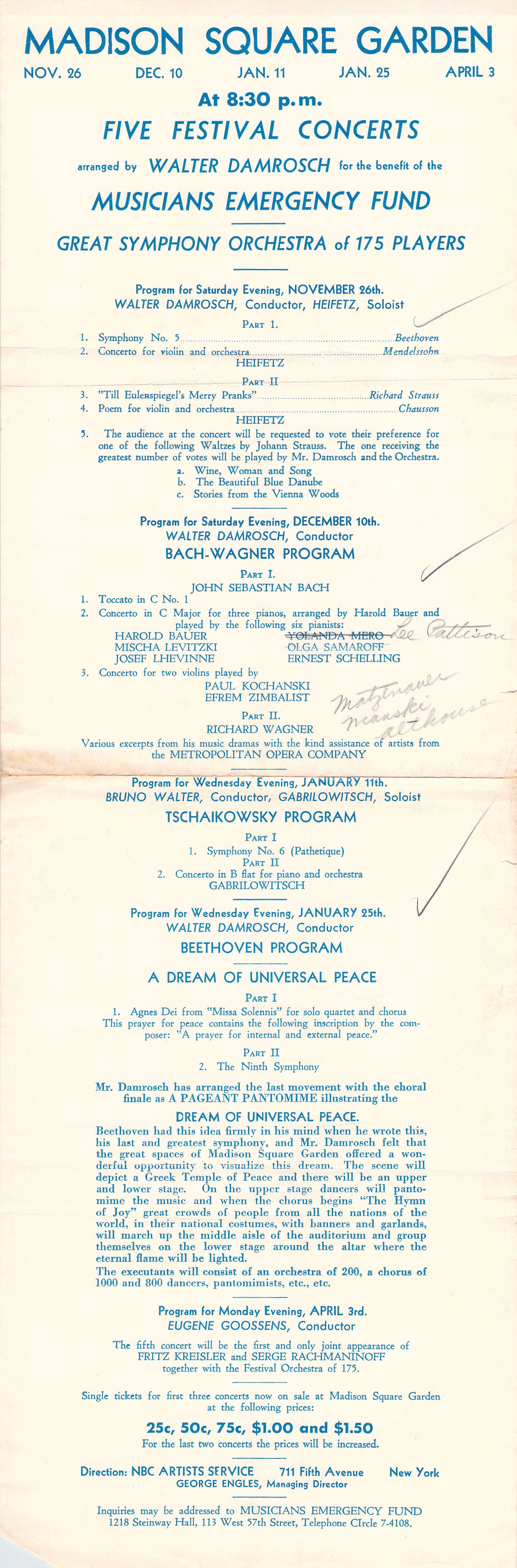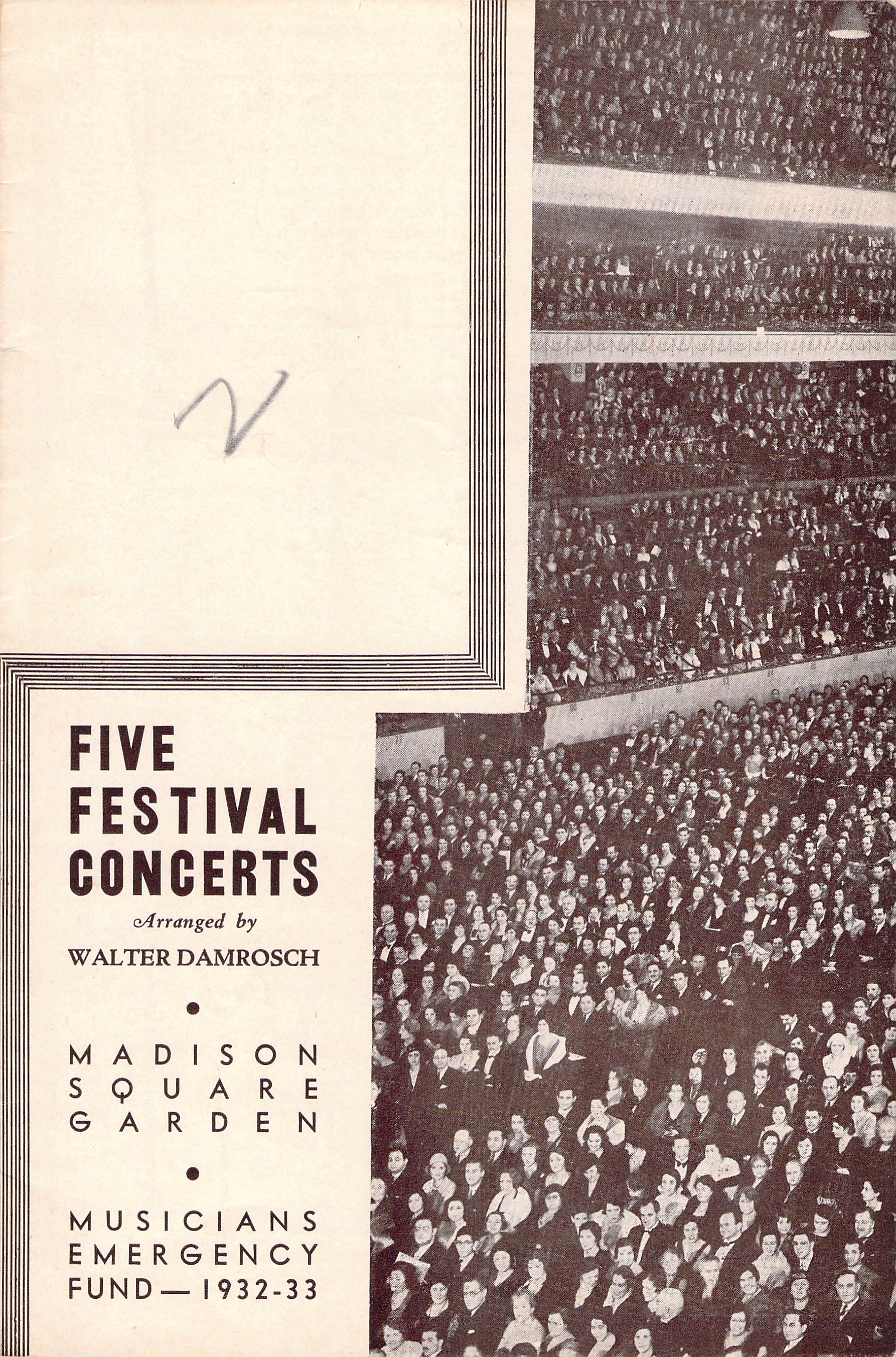 Playbill for the Five Festival Concerts at Madison Squad Garden, New York, 1933, featuring important artists such as Jascha Heifetz, Walter Damrosch, Ossip Gabrilowitsch, Harold Bauer, Mischa Levitzki, Josef Lhevinne, Paul Kochanski, Fritz Kreisler, Sergei Rachmaninov, and others.