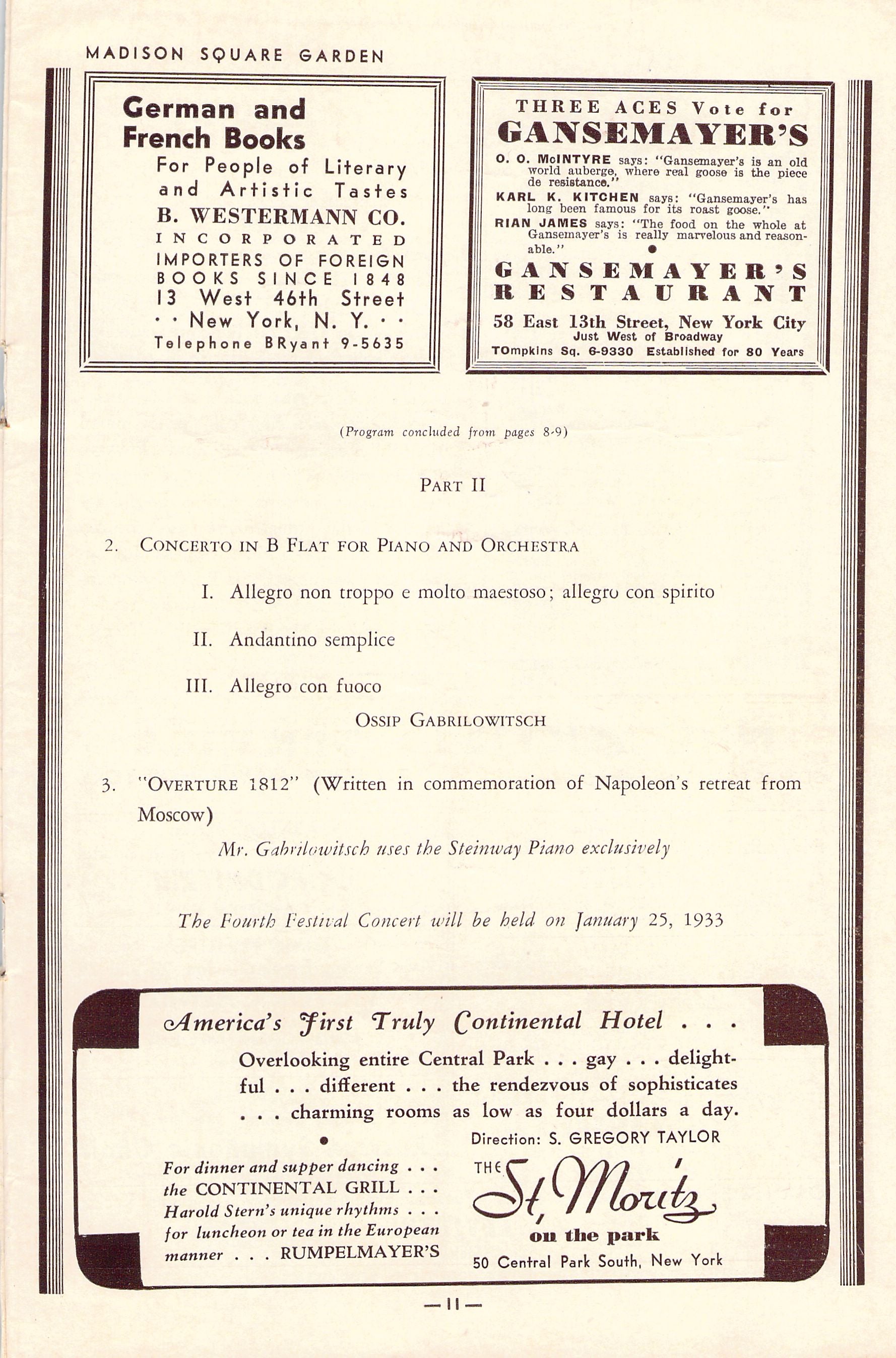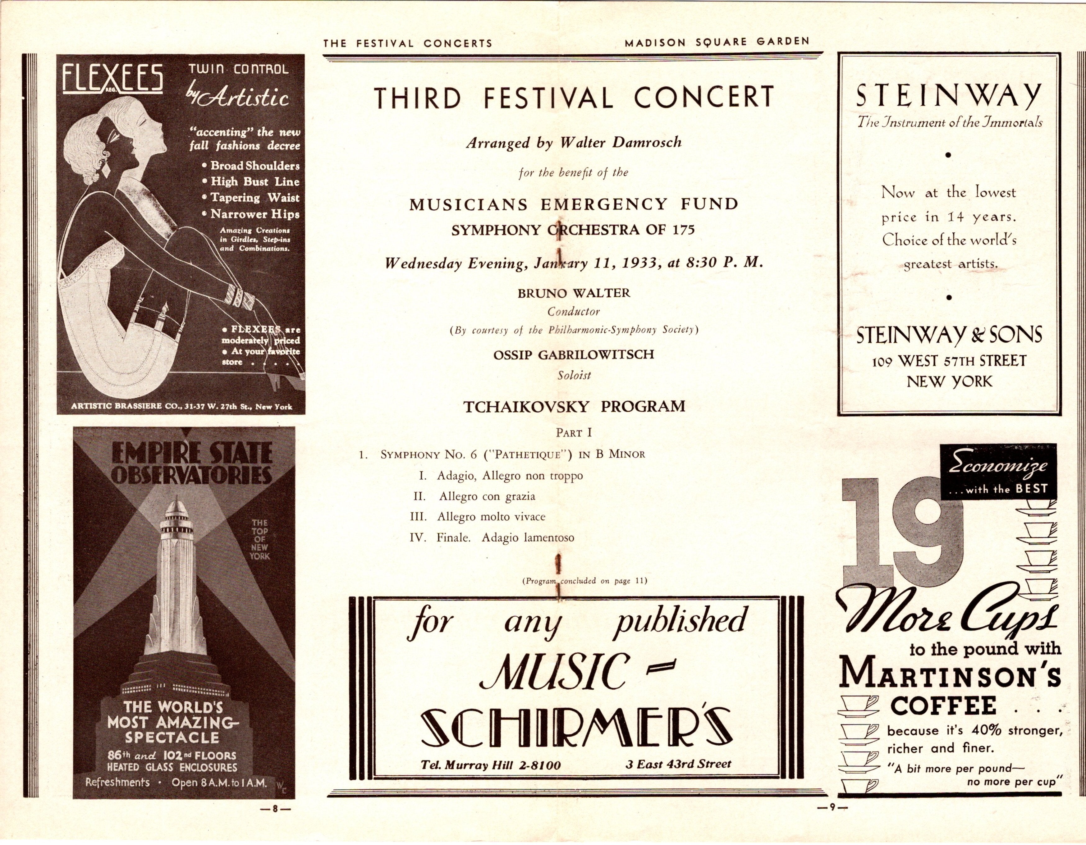 ALSO INCLUDED is an individual program for one of the concerts advertised in the playbill featuring Ossip Gabrilowitsch under the direction of Bruno Walter on January 11, 1933. Size is 6 x 9 inches, in excellent condition.