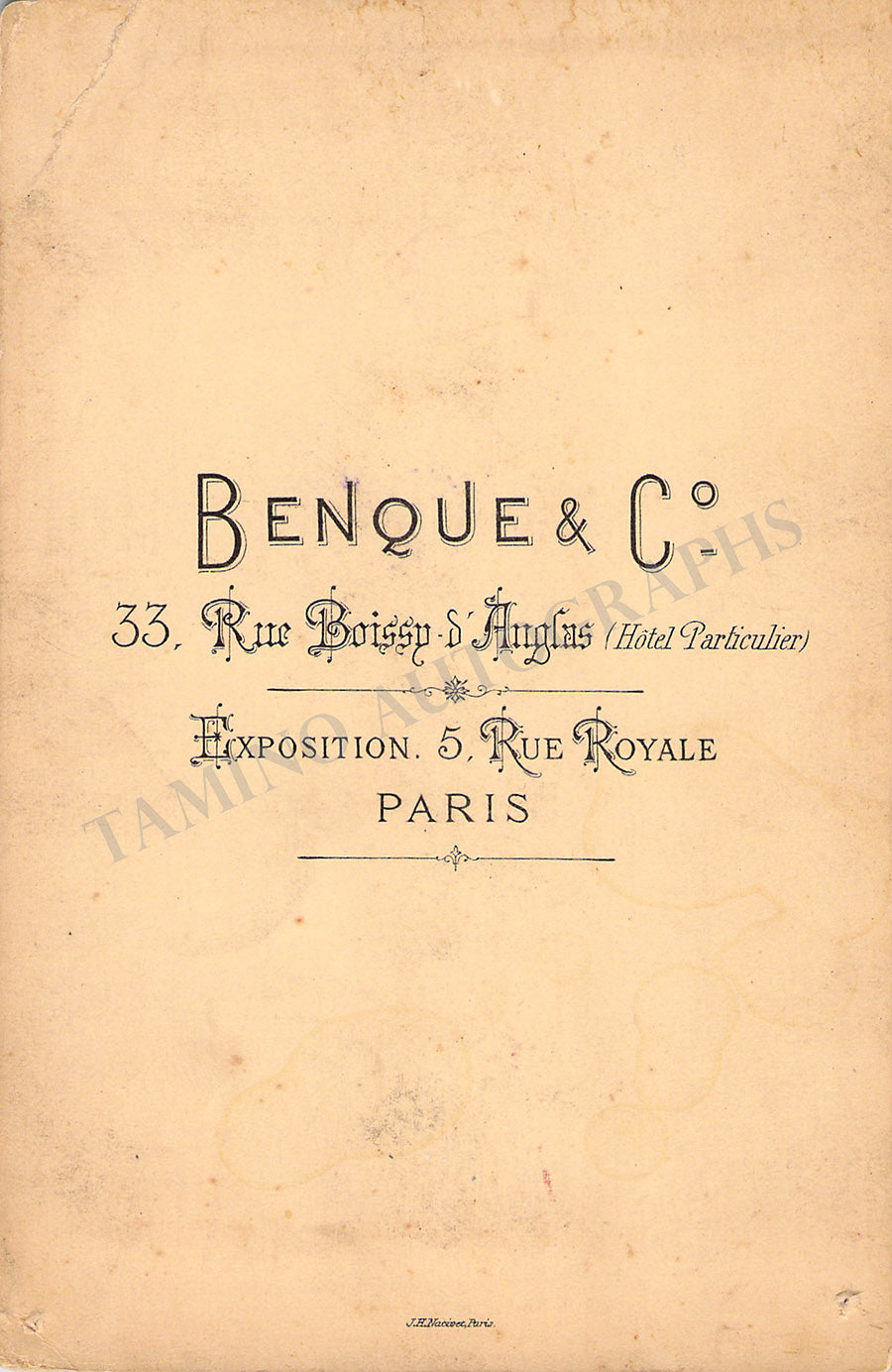 An original cabinet photograph by Benque (Paris) signed by the tenor in Paris, 1894, with a short sentiment. Size is 4.25 x 6.3 inches, minor holes over both lower corners, some stains, otherwise in overall very good condition.