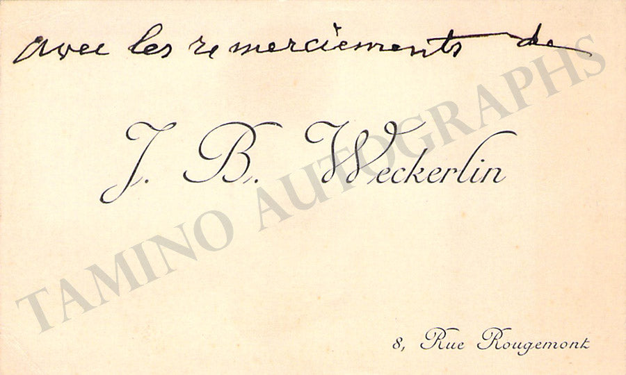 ALSO INCLUDED is Weckerlin's visiting card with a short sentiment written by him. Size is 3.6 x 2.2 inches, mounting traces on verso, otherwise in very good condition.