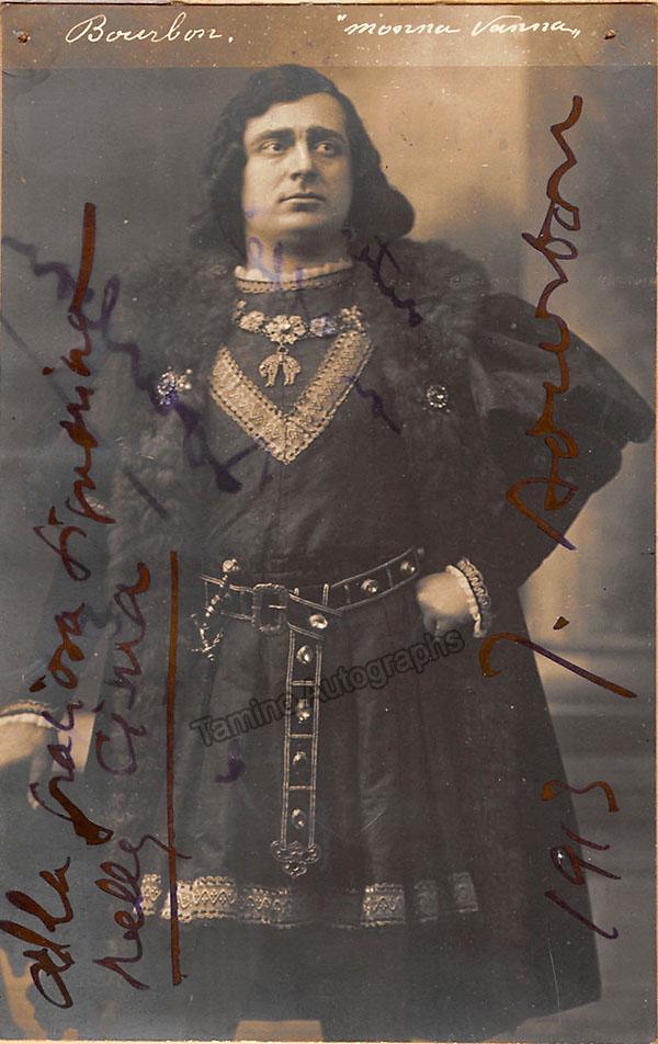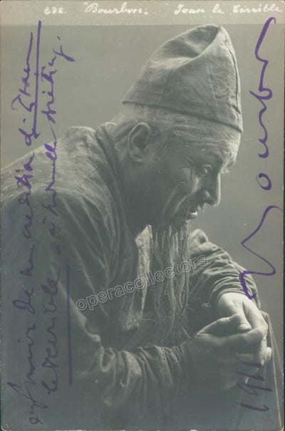 Signed photo postcard showing him in Ivan le Terrible (opera by Raoul Gunsbourg), dated in 1911, 3.5 x 5.25 inches.