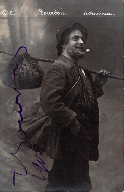 Signed photo postcard, shown in the title role Le Chemineau, opera by Xavier Leroux. Size is 3.5 x 5.5 inches.